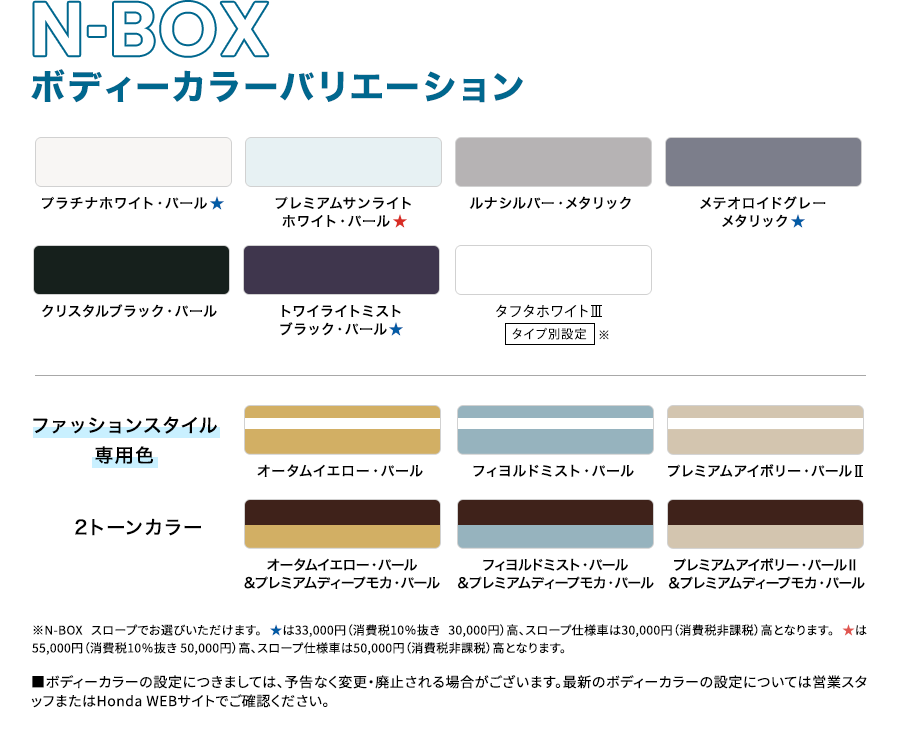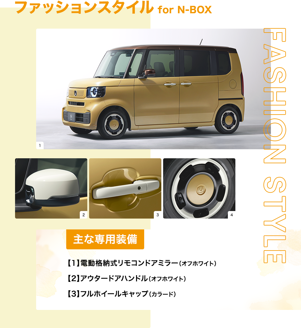 Photo:[1][2][3][4]N-BOX(FF)ファッションスタイル 車両本体価格(消費税10%込み)1,838,100円★ 価格には写真のメーカーオプション及びディーラーオプションの価格は含まれておりません。 ボディーカラーはオータムイエロー・パール [1]メーカーオプション(コンフォートパッケージ〈リア右側パワースライドドア など〉:78,100円高)、ディーラーオプション(N-BOX専用 9インチ Honda CONNECTナビ LXU-242NBi〈取付アタッチメント、パネルキット含む〉:259,600円〈取付工賃別途〉)装着車