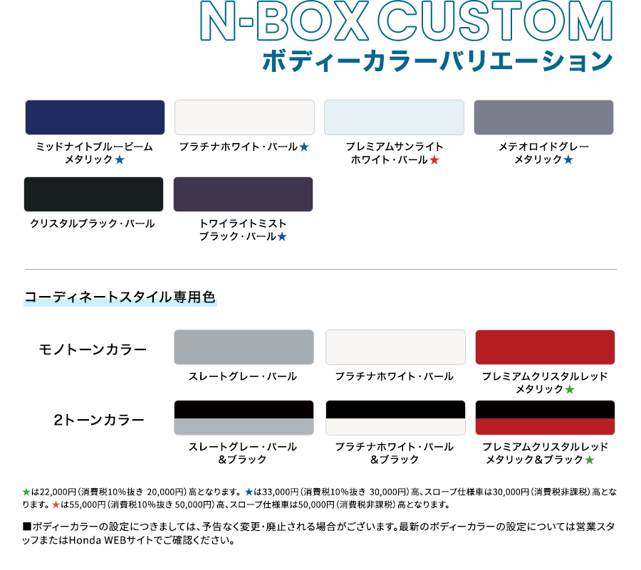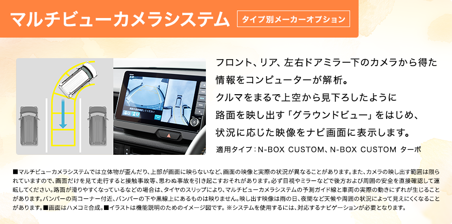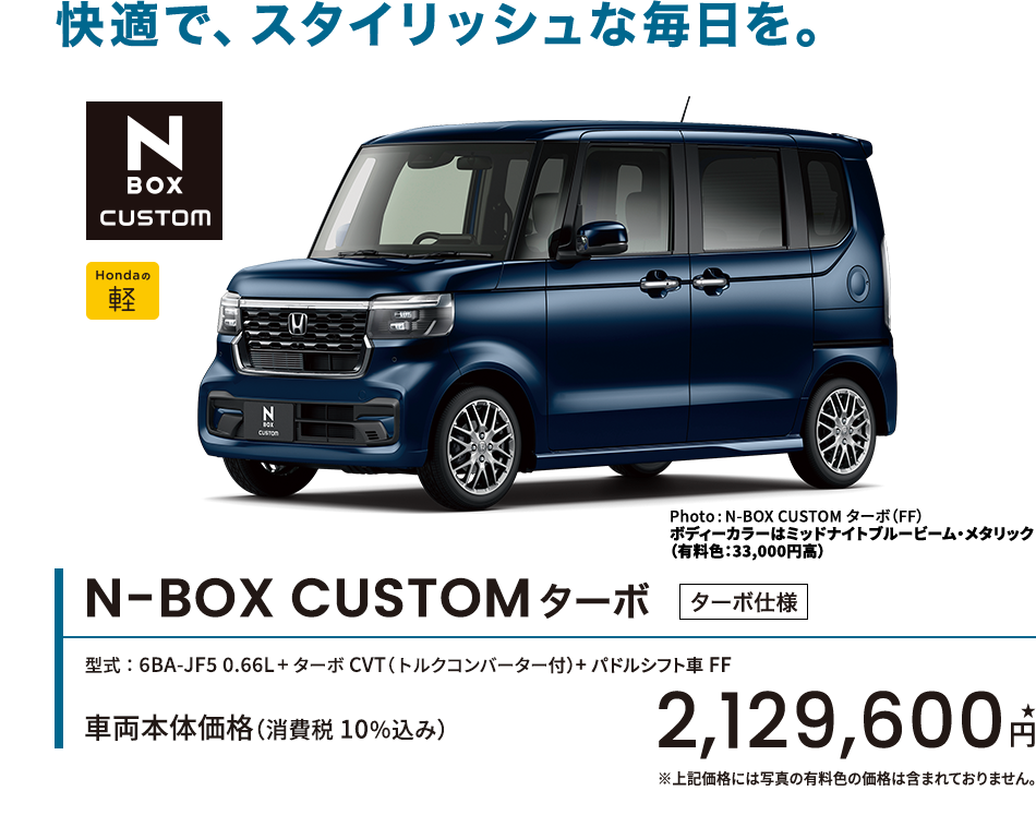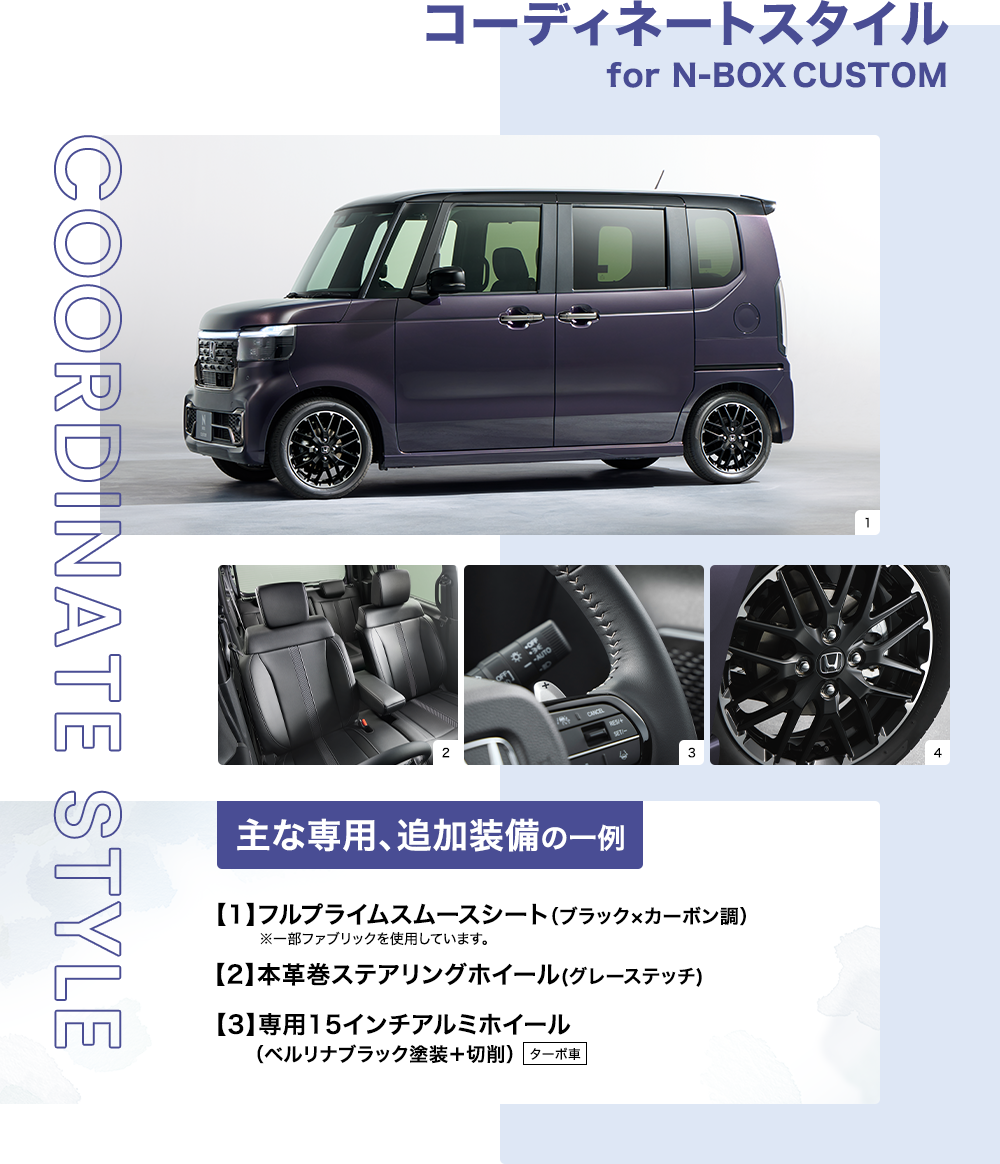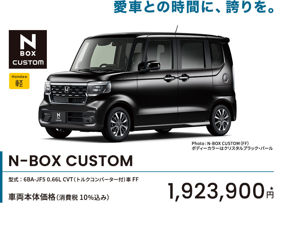 Photo:[1][2][3][4]N-BOX CUSTOM ターボ(FF)コーディネートスタイル 車両本体価格(消費税10%込み)2,281,400円★ 価格には写真のメーカーオプション及びディーラーオプションの価格は含まれておりません。ボディーカラーはトワイライトミストブラック・パール&ブラック [1]メーカーオプション(マルチビューカメラシステム:72,600円高)、ディーラーオプション(N-BOX専用 9インチ Honda CONNECTナビ LXU-242NBi〈取付アタッチメント、パネルキット含む〉:259,600円〈取付工賃別途〉)装着車 ■メーター類は撮影のため点灯。
