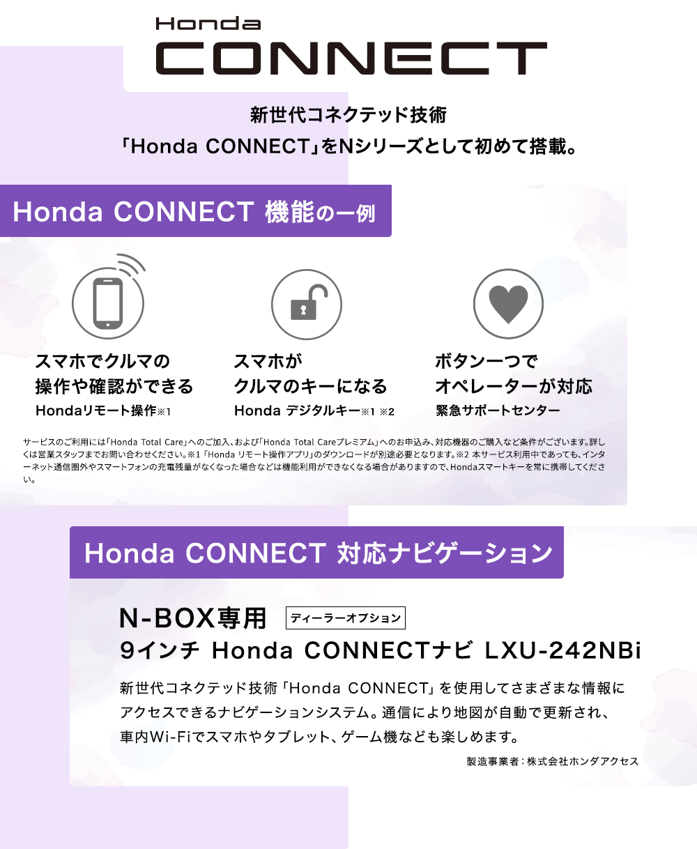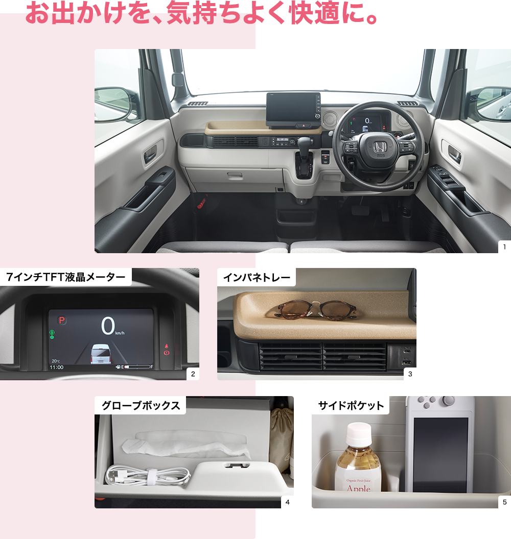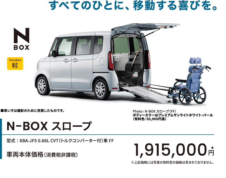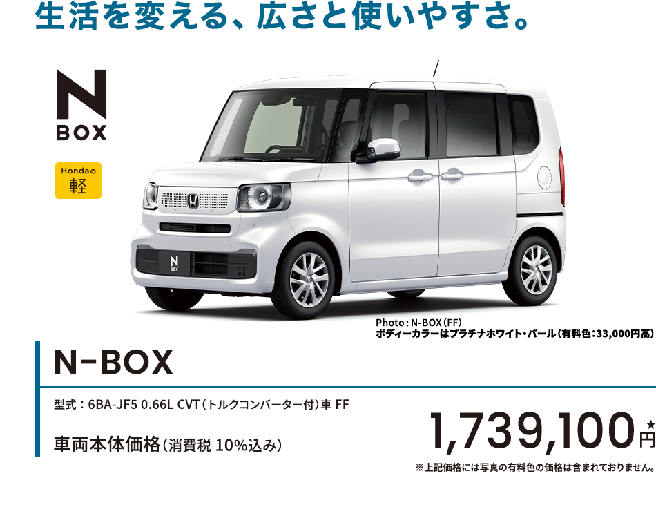 Photo:[1][2][3][4][5]N-BOX(FF)車両本体価格(消費税10%込み)1,739,100円★ 価格には写真の有料色及びメーカーオプション・ディーラーオプションの価格は含まれておりません。 [1]ボディーカラーはプラチナホワイト・パール(有料色:33,000円高) メーカーオプション(コンフォートパッケージ〈リア右側パワースライドドア など〉:78,100円高)[1][3]ディーラーオプション(N-BOX専用 9インチ Honda CONNECTナビ LXU-242NBi〈取付アタッチメント、パネルキット含む〉:259,600円〈取付工賃別途〉)装着車 [5]※スロープ仕様車は形状および装備が写真と異なります。■小物類は撮影のために用意したものです。■メーター類は撮影のため点灯。■画面はハメコミ合成。