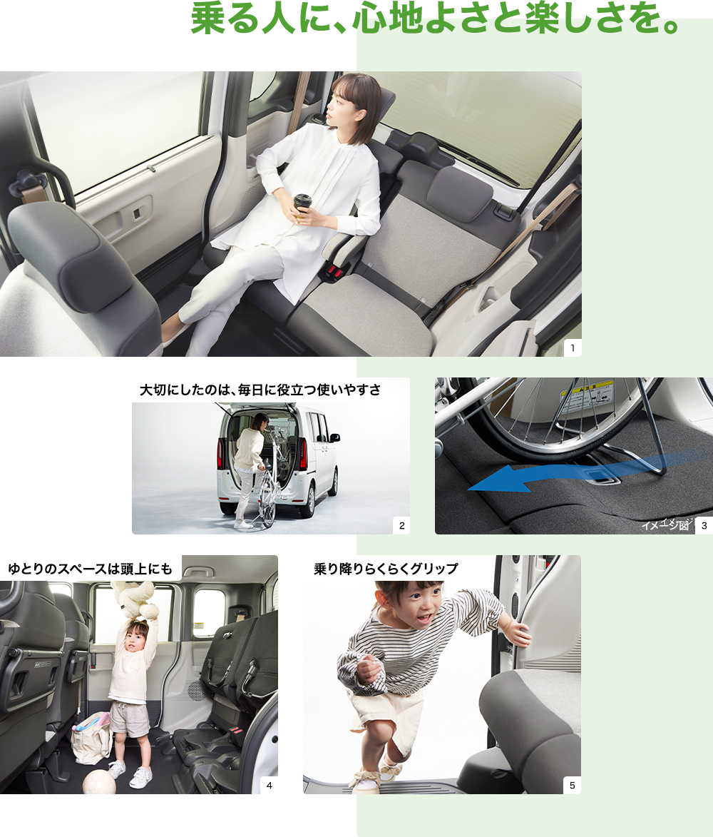 Photo:[1][3][4][5]N-BOX(FF) 車両本体価格(消費税10%込み)1,739,100円★ [1][4][5]価格には写真の有料色及びメーカーオプションの価格は含まれておりません。 ボディーカラーはプラチナホワイト・パール(有料色:33,000円高) メーカーオプション(コンフォートパッケージ〈リア右側パワースライドドア など〉:78,100円高)装着車 [2]N-BOX(FF) 車両本体価格(消費税10%込み)1,739,100円★ 価格には写真の有料色及びメーカーオプション・ディーラーオプションの価格は含まれておりません。 ボディーカラーはプラチナホワイト・パール(有料色:33,000円高) メーカーオプション(コンフォートパッケージ〈リア右側パワースライドドア など〉:78,100円高)、ディーラーオプション(N-BOX専用 9インチ Honda CONNECTナビ LXU-242NBi〈取付アタッチメント、パネルキット含む〉:259,600円〈取付工賃別途〉)装着車 ■自転車は撮影のために用意したものです。■写真は27インチ自転車。■自転車等のサイズ・形状によっては積めない場合があります。■シートアレンジの各操作は、異物を挟んでいないか確認の上、無理な力をかけず確実に行ってください。■安全のため走行の際は荷物をしっかりと固定してください。