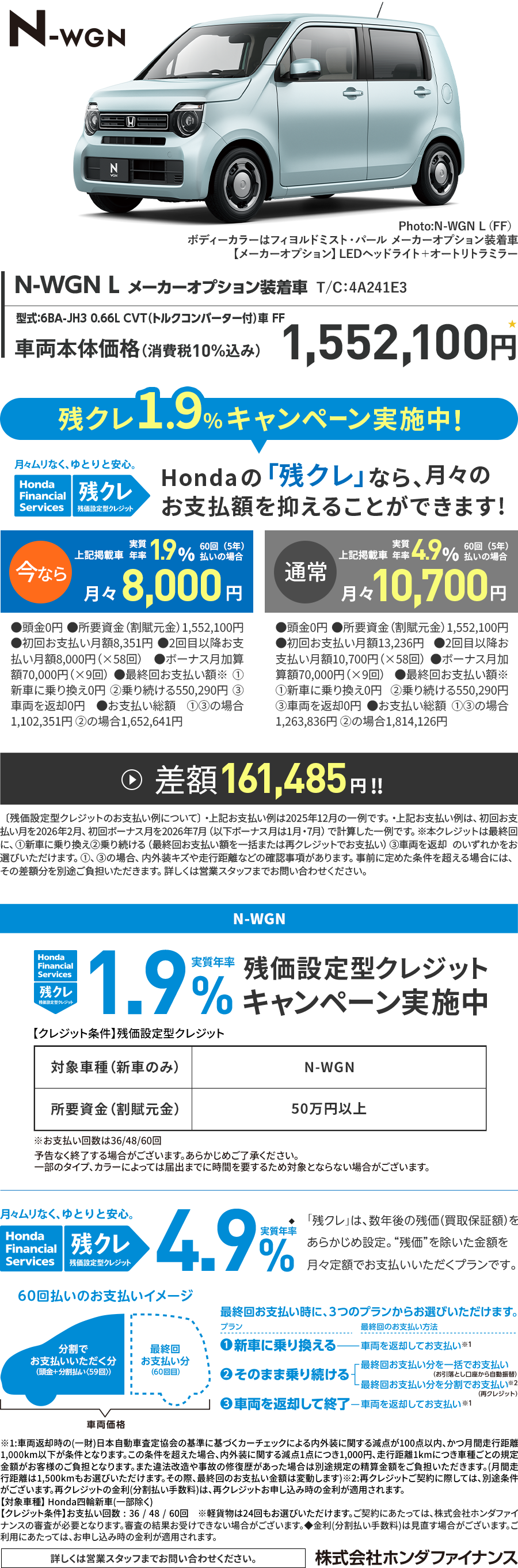 Photo:① ②N-WGN L(FF)車両本体価格(消費税10%込み)1,576,300円★ 価格には写真の有料色の価格は含まれておりません。ボディーカラーはプレミアムサンライトホワイト・パール(有料色:55,000円高) ③ ④N-WGN CUSTOM L・ターボ(FF)車両本体価格(消費税10%込み)1,912,900円★ ボディーカラーはクリスタルブラック・パール