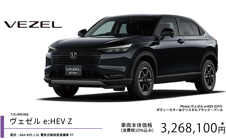 Photo:[01][03]ヴェゼル e:HEV Z(FF) 車両本体価格(消費税10%込み)3,268,100円★ 価格には写真の有料色及びメーカーオプションの価格は含まれておりません。 ボディーカラーはプラチナホワイト・パール(有料色:38,500円高) メーカーオプション(後退出庫サポート、Honda CONNECTディスプレー+ETC2.0車載器+ワイヤレス充電器、マルチビューカメラシステム+プレミアムオーディオ:374,000円高)装着車 [01]■メーター類は撮影のため点灯。■画面はハメコミ合成。 [02]ヴェゼル e:HEV Z(FF) 車両本体価格(消費税10%込み)3,268,100円★ 価格には写真のメーカーオプションの価格は含まれておりません。 メーカーオプション(後退出庫サポート、Honda CONNECTディスプレー+ETC2.0車載器+ワイヤレス充電器:231,000円高)装着車 [04][05][06]ヴェゼル e:HEV Z(FF) 車両本体価格(消費税10%込み)3,268,100円★ 価格には写真の有料色の価格は含まれておりません。 ボディーカラーはプラチナホワイト・パール(有料色:38,500円高) [04]■積載物、小物類は形状、サイズ等によっては積めない場合があります。■小物類は撮影のために用意したものです。■安全のため走行の際は荷物をしっかりと固定してください。[06]■写真は機能説明のためのイメージ図です。[07]ヴェゼル e:HEV X(FF) 車両本体価格(消費税10%込み)2,998,600円★ 価格には写真の有料色の価格は含まれておりません。 ボディーカラーはスレートグレー・パール(有料色:38,500円高) ■ETC2.0車載器を使用するには、別途決済用のETCカード、セットアップ作業(セットアップ費用)が必要となります。